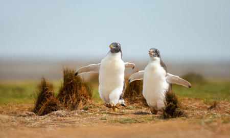 Two young, fluffy Gentoo penguin (Pygoscelis papua) chicks with their wings spread out run happily on tussock grass in a natural, wild environment in the Falkland Islands.