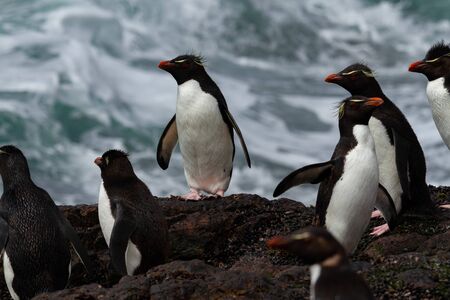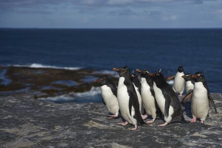 Southern Rockhopper Penguins (Eudyptes chrysocome) return to their colony on the cliffs of Bleaker Island in the Falkland Islands