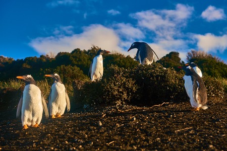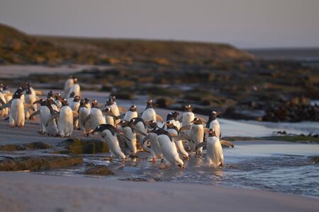 Gentoo Penguin (Pygoscelis papua) coming back to land after a day spent feeding at sea. Bleaker Island in the Falkland Islands.