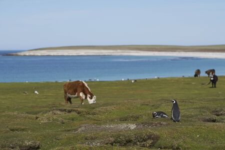 Magellanic penguins (Spheniscus magellanicus) outside their nest burrow shared with grazing cattle on Bleaker Island in the Falkland Islands.
