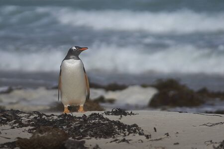 Close up of a Gentoo penguin standing on a sandy coast of Falkland Islands.