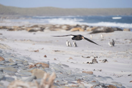 Southern Giant Petrel (Macronectes giganteus) flying over a beach of used for breeding by Southern Elephant Seals on Sea Lion Island in the Falkland Islands.