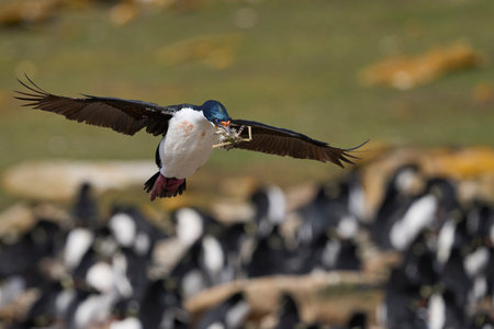 Imperial Shag (Phalacrocorax atriceps albiventer) landing with vegetation to be used as nesting material on Saunders Island in the Falkland Islands
