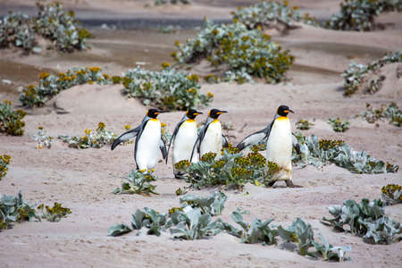 A group of four King penguins head to the beach at Volunteer Point, Falkland Islands