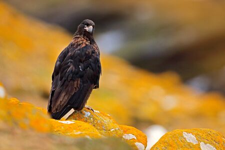 Caracara sitting on the yellow rock in Falkland Islands, Argentina. Caracara in nature habitat. Detail portrait of caracara. Young bird of prey Strieted caracara, Phalcoboenus australis.