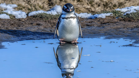 A solitary penguin stands by a reflective water surface, showcasing its striking features. The natural setting includes snow, grass, and a serene environment.