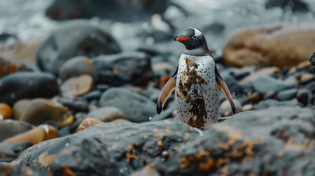 a penguin coated with oil stands on the rocks. Stones on the seashore. environmental pollution