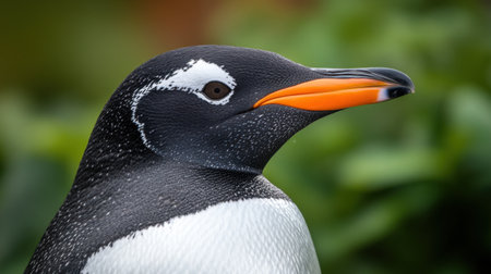 Stunning close-up portrait of a Gentoo penguin showcasing its striking orange beak and intricate feather patterns, set against a soft green background typical of its natural habitat.
