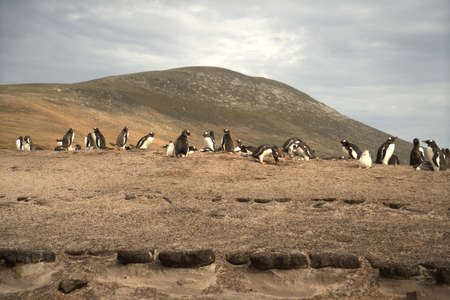 Colony of penguins (Pygoscelis papua) on Bleaker Island in the Falkland Islands.