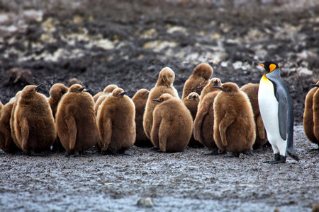 Close up of a juvenile king penguin with molting feathers, Falkland Islands.