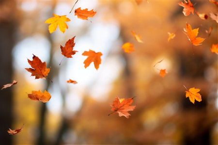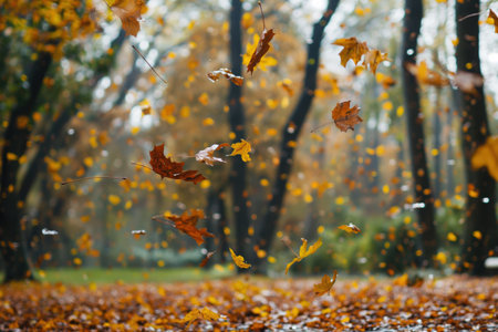 Beautiful autumn leaves falling in a serene park filled with vibrant colors during a sunny afternoon