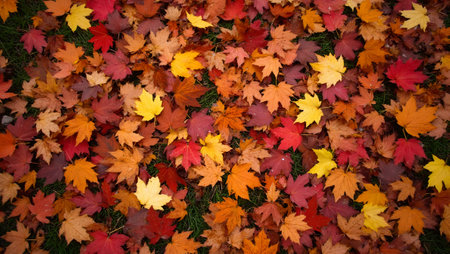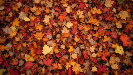 Autumn foliage display vibrant leaves in rich hues, arranged as a blanket, top view, flat lay