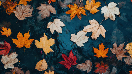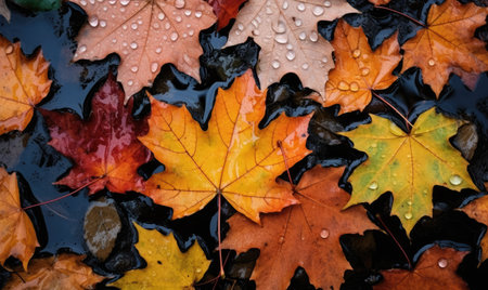 A Colorful autumn leaves with raindrops create vibrant, textured pattern