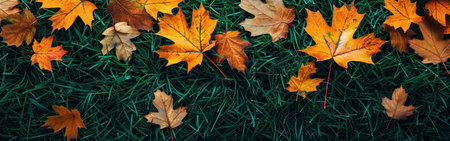 An image showing fallen autumn leaves on a bed of vibrant green grass. The leaves are in various shades of orange and yellow, creating a beautiful contrast against the deep green of the grass.