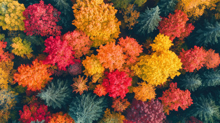 Aerial view of a forest in the fall, with vibrant red and yellow leaves, leaving space for copy.