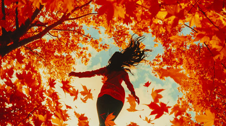 Woman enjoying autumn under a canopy of vibrant red orange leaves A girl with flowing hair stands beneath a tree with colorful autumn foliage, enjoying the season's beauty. Falling autumnal leaves.