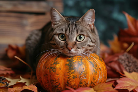 In a picturesque autumnal setting, a beautiful tabby cat camouflages amidst a carpet of vibrant fallen leaves The cat's keen gaze, framed by its expressive amber eyes, captures the essence of the season's warm hues and natural beauty This enchanting portrait showcases the harmony between nature and feline grace, creating a stunning seasonal image AI Generative