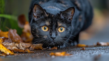 A sleek black cat is captured in a close-up shot, its intense yellow eyes contrasting with its dark fur. The animal is positioned on a paved surface, set against a blurred background of autumn foliage. The image employs shallow depth of field, suitable for various editorial and commercial applications. The lighting suggests a day setting.