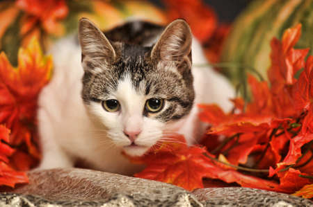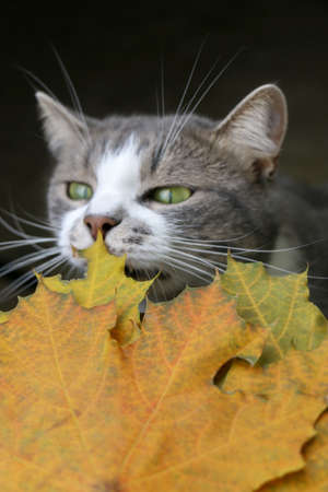 Autumn cat. A close up of a young cat with green eyes, playing in autumn leaves