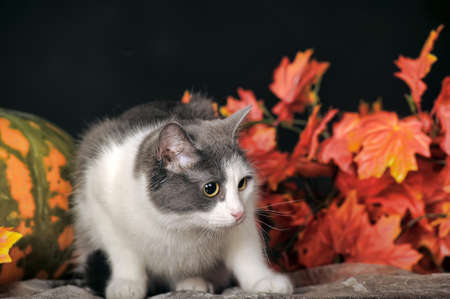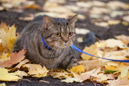 Portrait of a cute grey cat in autumn leaves. Selective focus.