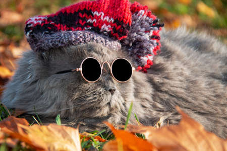A funny cat with round glasses and a red knitted hat lies on the autumn fallen leaves. Portrait. close-up.