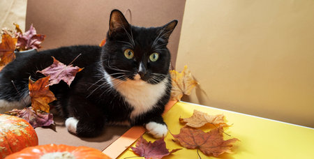 Black and white cat lounging comfortably on colorful surface, surrounded by vibrant autumn leaves and pumpkins, creating a warm and inviting atmosphere perfect for seasonal decor Copy space