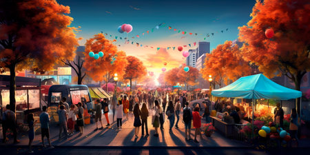 Festive summer street food festival, bustling with people sampling a variety of dishes, colorful stalls, live cooking demonstrations, vibrant and flavorful summer culinary experience.