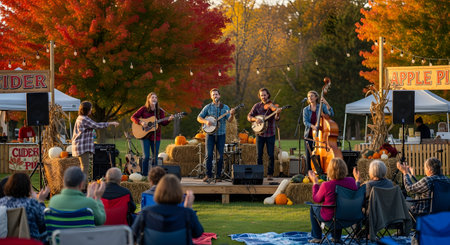 A folk band performs on an outdoor stage at a lively autumn harvest festival. The musicians play guitar, banjo, fiddle, and double bass, surrounded by hay bales and pumpkins, as an audience watches and claps.