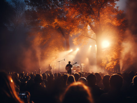 Outdoor evening concert with warm stage lighting and trees. Generative AI