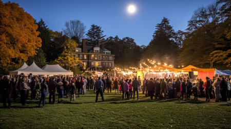 A lively night market illuminated by string lights, featuring food stalls and colorful autumn foliage. The bustling atmosphere and warm glow create a festive and cozy fall evening scene.