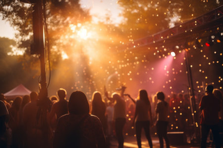 Evening outdoor music festival atmosphere enriched by colorful confetti cascading under vibrant lights, igniting joy