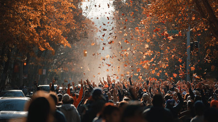 A vibrant outdoor event during autumn, featuring a large crowd gathered to celebrate under colorful fall foliage. The atmosphere is lively with smoke effects, flags, and a big screen displaying entertainment.