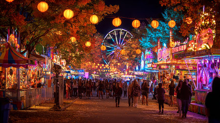 A lively fall festival with carnival games, pumpkin displays, and families enjoying the season