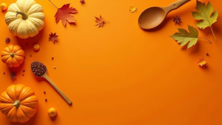 Autumn decorations with small pumpkins, leaves, and rustic utensils on a warm orange background.