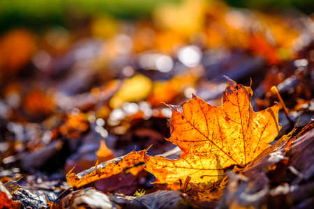 Autumn maple leaf on the ground. Beautiful nature background. Selective focus.