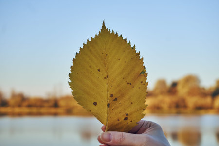 A human female hand holds a yellow large leaf, an autumn dry leaf, in the background of the lake. A lot of empty space.