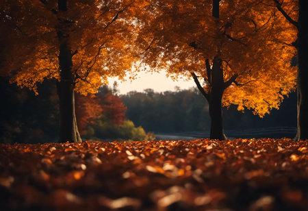Captivating view of golden autumn leaves scattered on the ground, bathed in warm sunlight, with trees creating a serene backdrop, representing the beauty of fall.