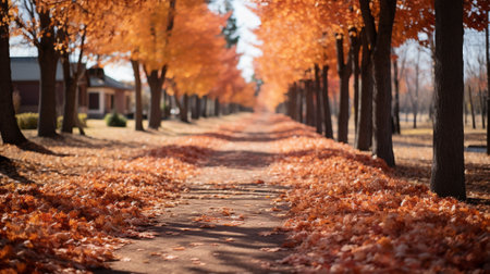 A tranquil autumn pathway lined with vibrant trees showcases the beautiful colors of fall. Fallen leaves adorn the paved road, creating a scenic view.