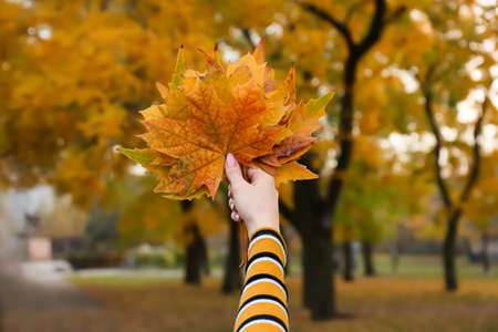 Woman holding fallen leaves in autumn park