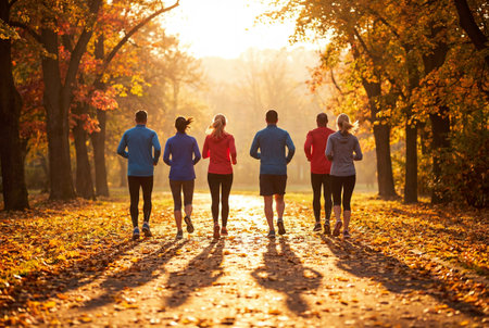 A diverse group of people jogging on a paved path in a park during sunset, with warm lighting and autumn foliage.
