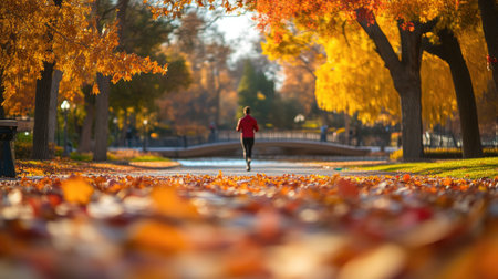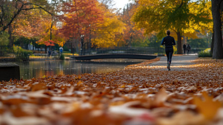Lively Urban Park in Fall with Jogger