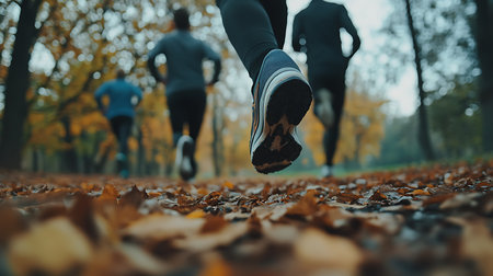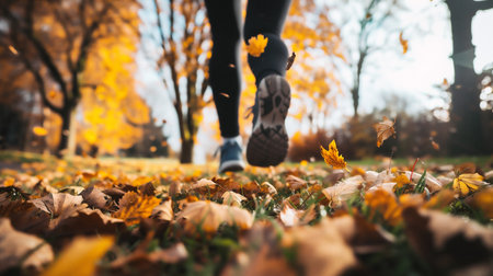 Autumn Jogging: Close-Up on Runner's Shoes Amongst Fallen Leaves. Generative ai. High quality illustration