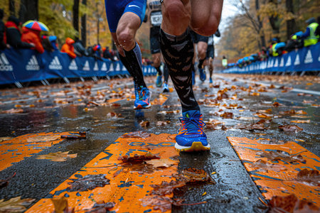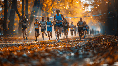 Determined athletes push themselves to the limit in a marathon on a rainy city street. The runners are surrounded by colorful fallen leaves and spectators line the streets to cheer them on.