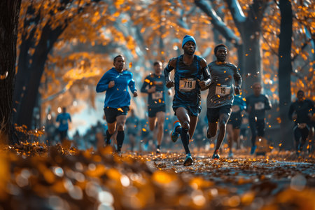 Focused man leading group run in autumn park, with fall foliage in background.