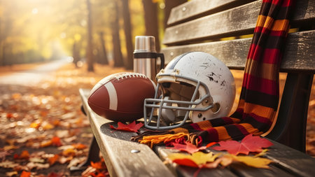A cozy autumn scene featuring a football, helmet, thermos, and plaid blanket resting on a wooden bench surrounded by fallen leaves.