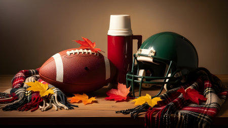 A cozy autumn scene featuring a football, a thermos, a helmet, and a scarf on a wooden table with fallen leaves.