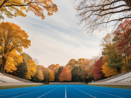 AI Generated. Blue running track in stadium surrounded by autumn trees