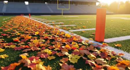 Colorful red and yellow autumn leaves are scattered across the yard line of an empty football field on a sunny fall day. The peaceful scene captures the nostalgic feeling of the end of a sports season.