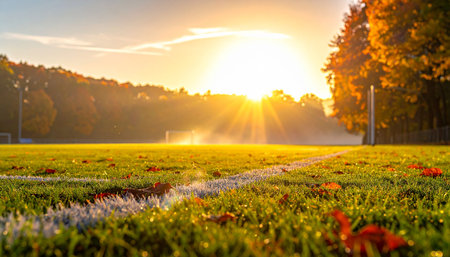 Sunset on the football field with grass and flowers. Beautiful autumn landscape.