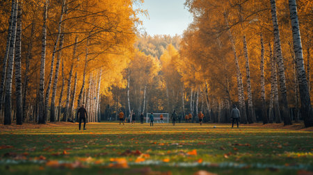 A serene sunset scene showcasing a soccer ball resting on a bed of fallen leaves, perfectly capturing the essence of autumn and the joy of outdoor sports.